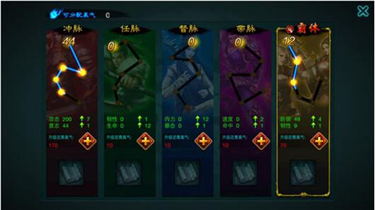任务、活动、家族商店以及每日VIP奖励等均可以获得用来提高经脉等级的真气值,小伙伴们想要提高经脉等级,只需要点击经脉系统上的"+"号便可轻松提高经脉等级。