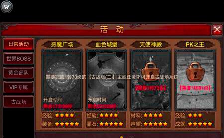 全民奇迹古战场需要1转70级完成主线任务方可开启,每天进入古战场的时间为30分钟,古战场有八倍经验和八倍掉率,经验方面进入古战场之前最好在商城内在购买一个3倍经验印章,这样刷怪的时候经验会高出很多,在选择刷怪地点的时候,小编这建议可以找一处3个怪物的刷新交叉点,这样刷怪效率会提高很多;掉率方面小编在古战场内最好也只打到绿装,蓝装、紫装都没见到过,所以古战场还是以刷经验为主。
