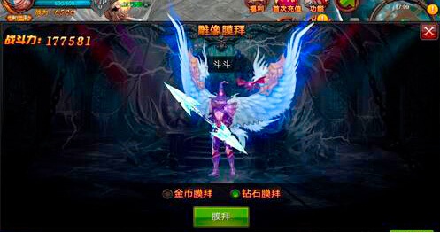 雕像膜拜分为金币膜拜和钻石膜拜,每日可进行一次,玩家本人等级越高所获得经验越高;钻石膜拜所得经验是金币膜拜2倍,声望为4倍。