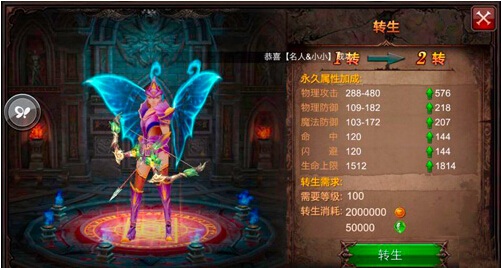 人物转生需求:人物等级需要100级,消耗200W金币和5W魔晶在勇者大陆转生使者处转生。