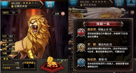 从属性上来看,狮子并不是那么出色。作为一只野兽,没有装备的加成,不过其自身的天赋嗜血利齿,成长获得的属性增加10%,很好的弥补了这一缺点。另外,回合开始失去5%生命,暴击伤害增加25%,可叠加5次。意味着5回合叠满可以使得自身暴击伤害增加125%,是不是非常可怕呢?配合必杀技使用,简直如狮添翼,同时再和洛林,火鸟,春日等暴击及爆伤角色成为好基友,还不是把对面打的不要不要的?