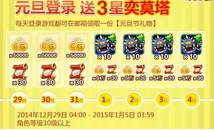 4日,奕莫塔碎片×10个(可进化3星奕莫塔!),金币5万、扫荡券×30