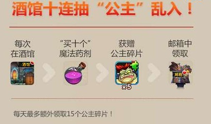 1. 活动期间,每次在酒馆使用符石“买十个”魔法药剂,将会额外获赠5个公主碎片,邮箱中领取。