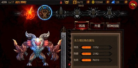 说到了“变身”选项,就必须介绍一下邪神系统。结合前面提到的世界观,每位玩家都能获得冥界五大邪神嗜血、黑暗、狡诈、恐惧、毁灭的力量,玩家初始只能唤醒嗜血邪神的力量,需要逐步开启后面4个邪神。每个邪神都有10个星级,星级越高可增幅的属性越强。在战斗中击杀怪物可以获得魂力,用来唤醒邪神并且增强邪神的力量,以及提升邪神的星级与学习邪神技能。唤醒邪神后,邪神会为玩家增强自身属性,并且在战斗中可以使用该邪神的变身,进行2次增幅。战斗中变身邪神后,不仅自身血量变满,而且变身状态中受到伤害只会消耗邪神的生命,而主角自己不会受到伤害。需要注意的是,五大邪神的属性增幅是可以叠加的!
