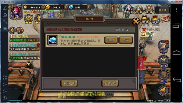 然后就是竞技场,进入前1000名,每当名次达到一个新高时都会有相应的钻石奖励,但是这个奖励只有一次哦。竞技场还是要靠操作的,试试蓝光手游大师,让你轻松进入排行榜。