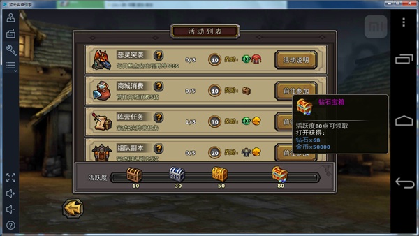 还有一个就是每日活跃奖励了,完成相应的任务获得活跃度,活跃度到80后会得到一个钻石宝箱,可以获得68钻。