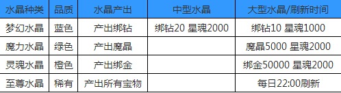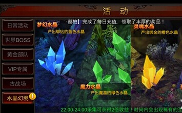 水晶幻境是游戏内全新添加的系统,可以在活动的界面找到他,玩家们可以在游戏中采集各种水晶,水晶会给玩家们提供星魂和绑钻,还有魔晶等等,水晶一共分为4种每一种奖励的道具也有所出入,每天22:00-24:00可以获得2倍的收益,同时也会出现稀有的至尊水晶。