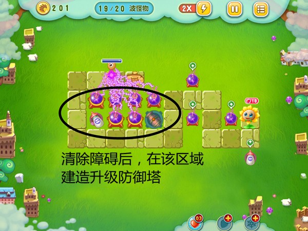 本关的障碍并不多,而且也较为容易被清。关键障碍点在于中间的一根树,清除完这根树就可以获得一根圆珠塔。这根防御塔和前面所建造的闪电球配合就可以在前期保证游戏火力的输出。只需在后排建造两根闪电球就可以安心地清理障碍物。