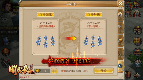 兵法强化使兵种升级,也能使玩家的战斗力迅速提升,提升兵种等级需要大量的银两和强兵丹,强兵丹可通过跨服竞技场商店、熔炉商店、普通商人、公会商店以及英雄关卡中获取。