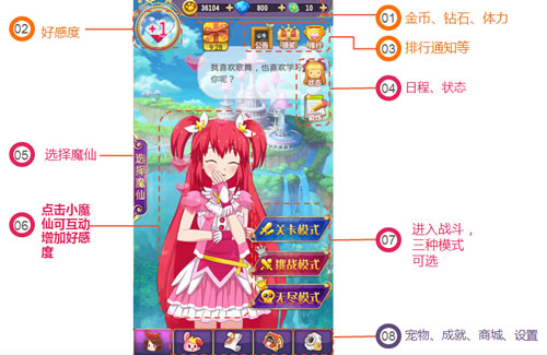 而主界面最有意思的在于人物角色。你只需要用手指轻轻点击人物,小魔仙就会给予你不同的回应。她会讲她的故事、她的感受,还会卖萌、问你问题等等。与小魔仙互动可以增加她对你的好感度。而通过左上角的图标,则可以看到当前的好感度了。不过,如果答错问题,小魔仙很可能不高兴哦,你要注意啦~~