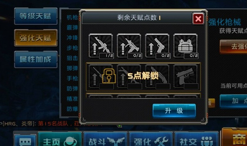 通过枪械强化改造可以获得强化天赋点。至于要先强化什么,这就要根据你自己擅长的枪械类型来加了。不过,建议先加防弹涂层和你擅长的枪械类型,总之手雷,刀,手枪这三项不建议早期强化。