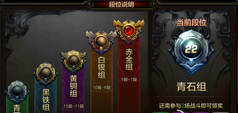 2) 右侧部分,最上方的22表示当前段位,点击22的段位徽章可进入段位说明页面,一共5组共25个段位,分别是青石、黑铁、黄铜、白银和赤金组。