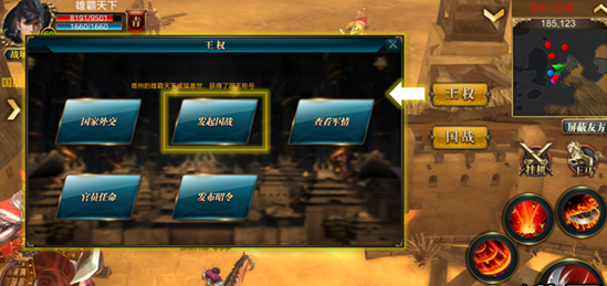 由本国国王点击主界面上的【王权】按钮,打开王权设置面板,点击【发起国战】,选择攻击目标国家,然后发起国战。第一天国战结束到次日12点前宣战国战,将于第二天晚上8点半开战,当日12点之后到24点之前宣战国战,会在宣战次日晚上8点半开战。国民将收到提示: