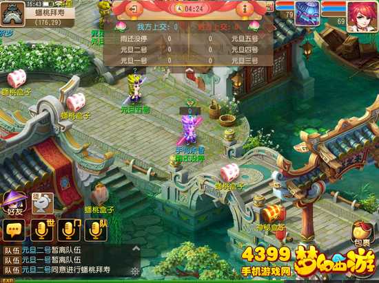 “寿星”下凡贺岁,想品尝人间珍果——蟠桃,三界之士为争“寿星”青睐,竞相摘桃拜寿。玩家三人组队参加活动,两只队伍在5分钟内尽可能多的收集蟠桃,率先上交100个蟠桃给寿星的队伍获胜,在活动过程中,玩家开启“神秘盒子”可以触发很多有意思的特殊事件。