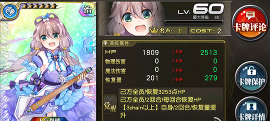 点评:可以说这张是洛天依这么多卡之中的大奖卡,2C歌姬奶卡不卡手,3chain自带回复量提升,本身带有恢复,对于国服还没普及1CB叔系列属性的情况下是非常好用的。