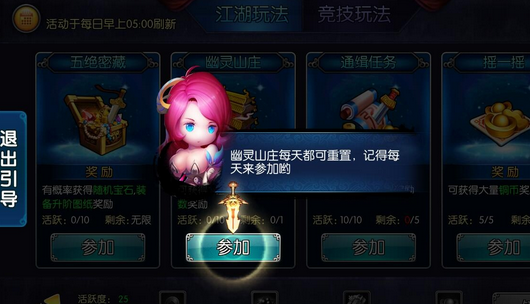 玩家点击游戏主界面右上角玩法按钮然后就可以看见江湖玩法中的幽灵山庄。幽灵山庄29级开启,通关副本可以获得修炼符和大量铜币奖励。还有幽灵币可以用来换侠客碎片。