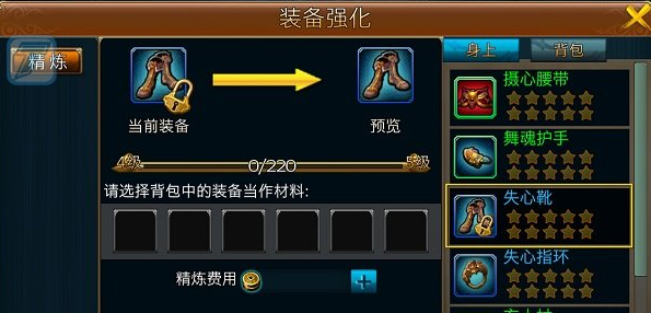 放入需要精炼的装备,然后将不需要的装备当做材料来提升现有装备的等级,可以使用一键放入大量材料装备,点击精炼,当进度条满了之后,精炼的装备就会提升等级,成为更高级的装备。