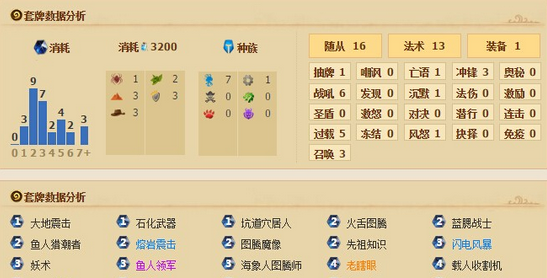 首先是随从,鱼人采用2领军2蓝腮2猎潮1瞎眼的7鱼,因为套牌核心鱼人恩典减费靠鱼人数量,所以加入猎潮增加铺场,提高恩典提早buff的几率。低费随从例如穴居人、火舌、魔像、图腾师、收割机都是为了早期站场进行交换和吸收火力的,因为套牌没有奶,所以早期避免太失场面很重要。塞布、大帝、火爹都是功能牌就不多说了,水领主是打到后期补充手牌关键,而且鱼人牌跟恩典能很好配合。