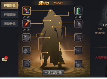 3、 也可直接点击右下角的一键升级,即可将所有神器直接培养到可升到的最高等级。