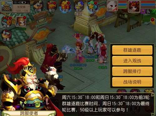 等级在50级以上玩家可以去长安城NPC跨服使者那里申请参加群雄逐鹿跨服比武活动,个人或者组队皆可。比武分为三组,等级50-59为精锐组;60-99则是勇武组;100及以上为神威组,队伍等级必须同一组,且由于升级换组则原积分清零。比武中伙伴不能出阵,只能使用战场商店的专属道具。上分,我们只靠实力。
