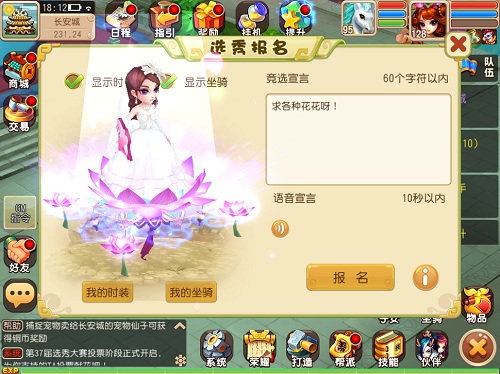 参赛选手可以选择自己的参赛宣言,若是声音甜美的妹子玩家一定不要忘记来一段语音的宣言,这可是快速提升个人人气的捷径哦。每一次选秀大赛都将选出最受欢迎的3位女神进行颁奖,除了丰富的道具奖励之外,作为冠军还能获得在长安城展示个人模型的荣誉。艳冠群芳,莫不如是。争艳已经开始,就看谁能够一枝独秀了。